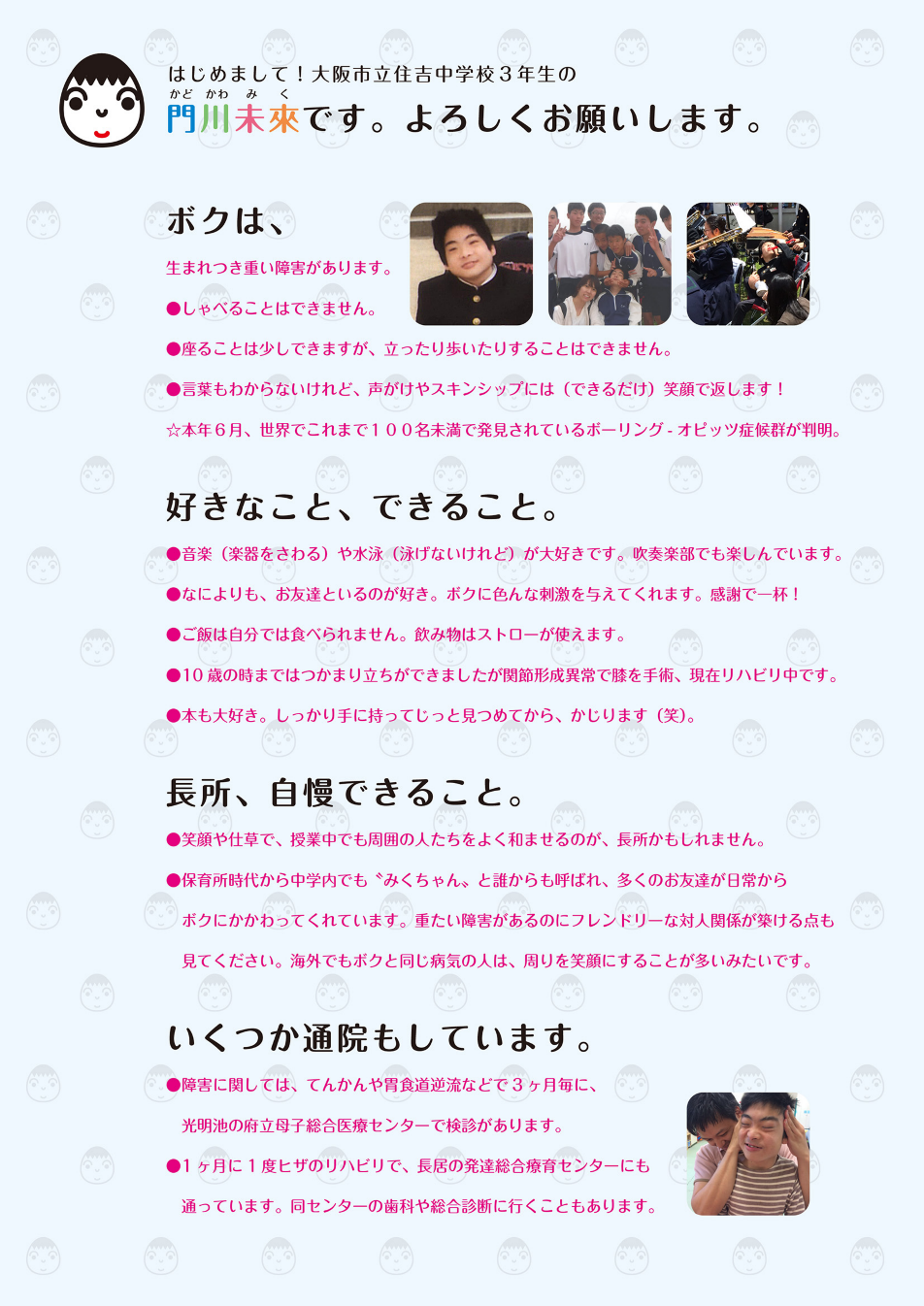 病気がわかるまでは、施設に預けるときも学校に行くときも、施設の人や先生たちが困らないように、これをみたら誰でも対処法がわかるような、絵を付けたのマニュアルを作って渡してましたね。お腹が空いたとか、どこが痛いとか、自分の状態を言葉で言えないですし、親じゃないとわからないことってたくさんありますからね。今通ってる学校でもやってます。